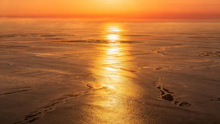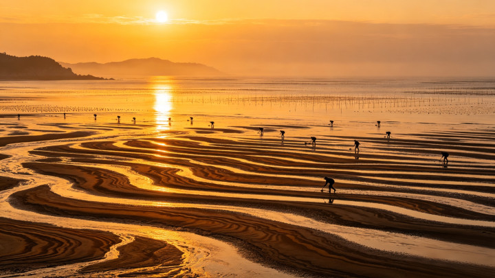 北岐滩涂是霞浦日出摄影核心地标,被誉为中国滩涂摄影第一村。日出时分,潮水退去,滩涂呈现层次分明的虎皮纹理,渔民劳作剪影与光影相融,画面质感饱满。日出前后一小时,山坡观景台可完整收录滩涂全景与日出盛景。