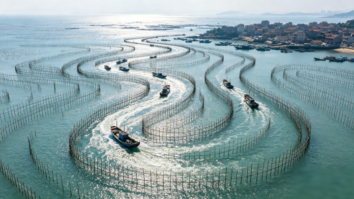 沙江S湾以独特线条美学成为摄影经典,S形航道穿梭于成片养殖竹竿之间,渔船缓缓穿行,构成水墨意境十足的画面。登高俯拍,潮水半退时,滩涂与航道线条感最为清晰,出片率稳定。
