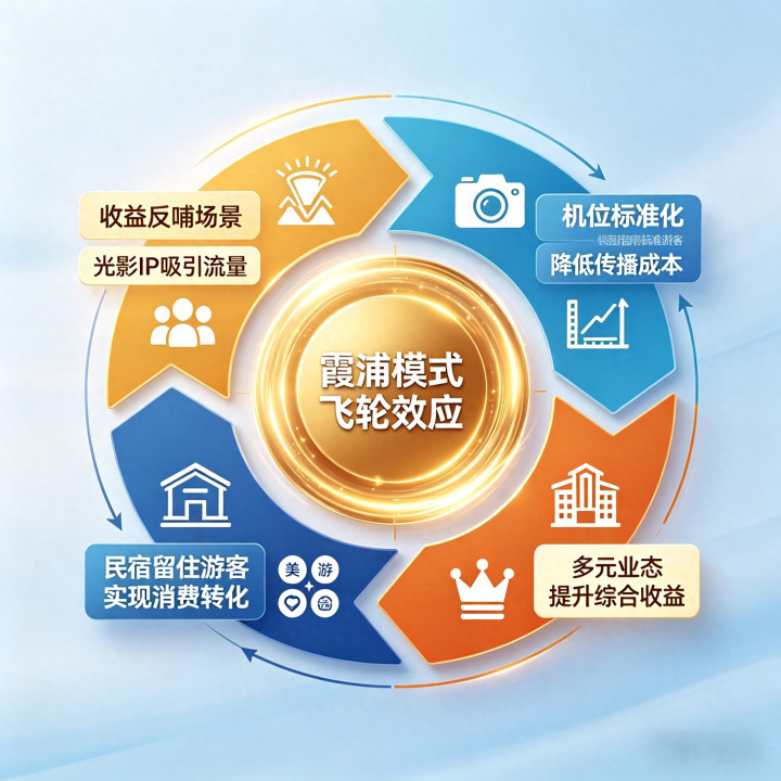 整个模式形成一轮强劲飞轮:光影IP吸引流量→机位标准化降低传播成本→民宿留住游客实现消费转化→多元业态提升综合收益→收益反哺场景升级与品牌打造,实现良性循环发展。